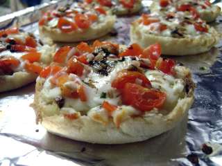 I pop the sandwich thin in the toaster on a low setting so that it gets a little crunchy. After it comes out, spread a tsp of sauce on each half, distribute the veggies evenly between the two halves, then sprinkle the cheese over the top. Microwave for about 30-40 seconds, just long enough to melt the cheese. And, you’re done!