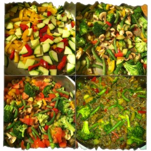 2. Add chopped peppers, zucchini and green beans. Saute until veggies start to soften, approximately 5 minutes. Add broccoli and continue to saute, approximately 2 more minutes. Add mushrooms and continue cooking, stirring occasionally, until mushrooms start to “shrink”, approximately 3-4 minutes. Add tomatoes, and continue to saute for another minute or two.